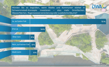 Deutschland will die Schwammstadt. Fast 90 Prozent der Befragten wollen mehr Grün und Blau in ihrer Stadt, mehr Klimaanpassung und auch mehr Starkregenvorsorge. Überwältigende 72 Prozent der von Civey Befragten würden stärkere Investitionen in diesen Bereichen in ihrer Kommunen „auf jeden Fall“ begrüßen. Weitere 14 Prozent sehen mit „eher ja“ Investitionen in blau-grüne Infrastrukturen ebenfalls positiv. Auf direkte Ablehnung stoßen diese Konzepte zur Klimaanpassung bei lediglich fünf Prozent der Befragten. Das Schwammstadtkonzept überzeugt die Bürgerinnen und Bürger. Ein klarer Handlungsauftrag für die Kommunen.