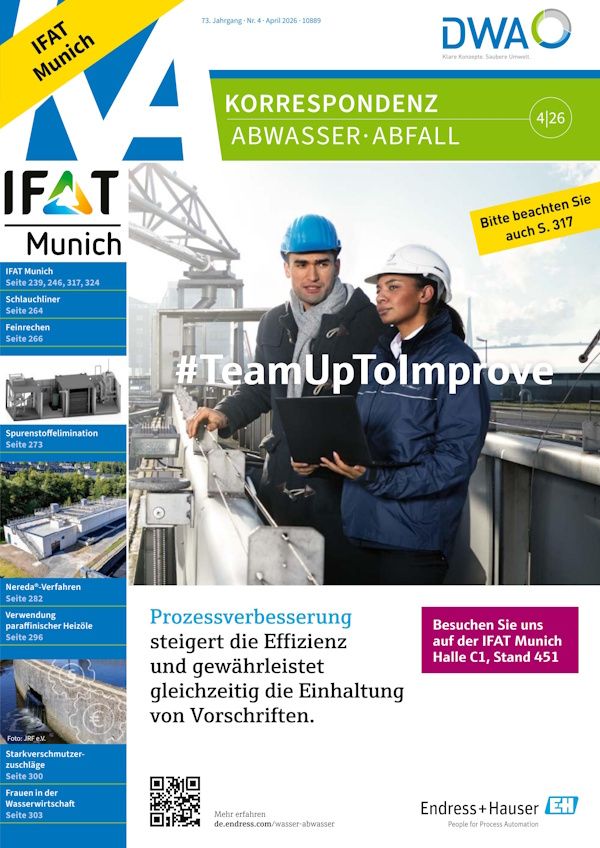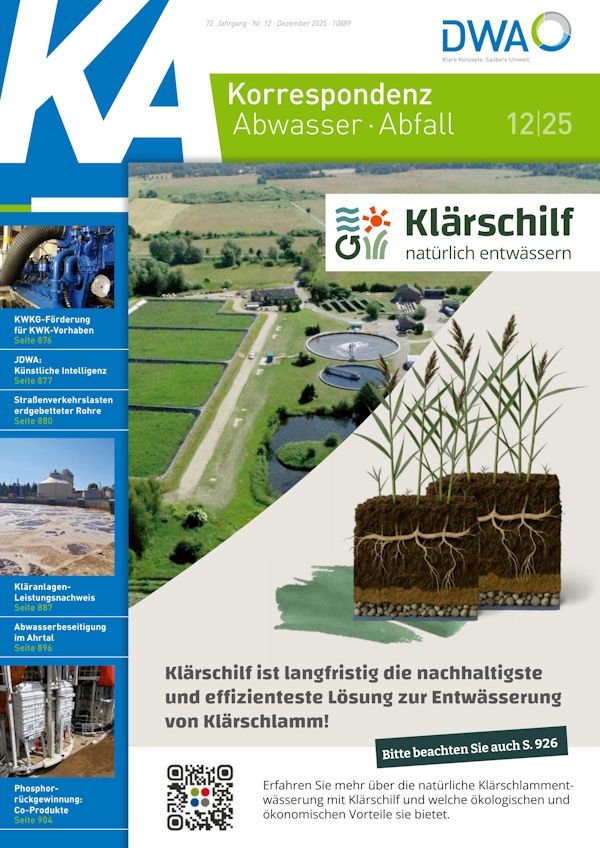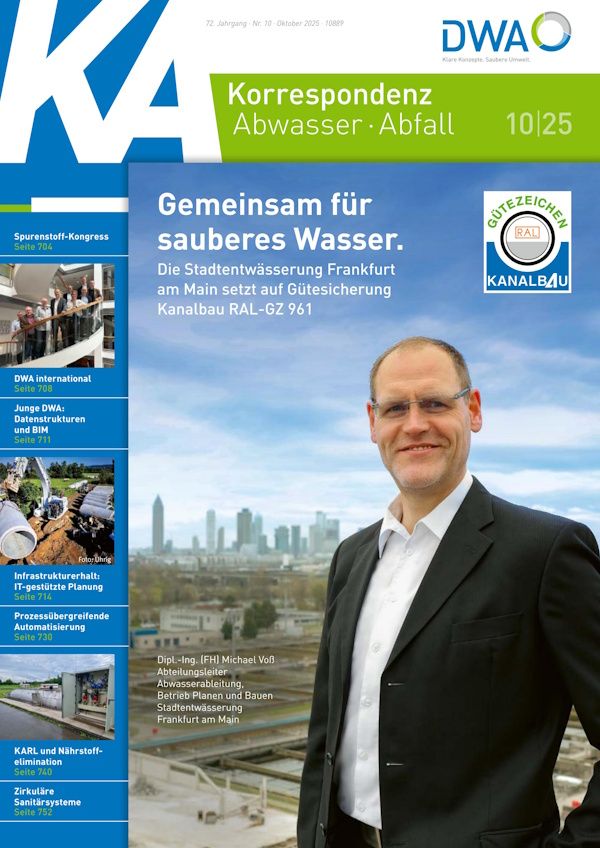 Die KA Korrespondenz Abwasser, Abfall ist das monatliche Organ der DWA und des Güteschutz Kanalbau e.V. Der redaktionelle Schwerpunkt liegt auf den Entwässerungssystemen, der Behandlung kommunaler und industrieller Abwässer sowie der Entsorgung und Verwertung von Reststoffen, wie Klärschlamm, Rechengut, Fettabscheiderinhalte.