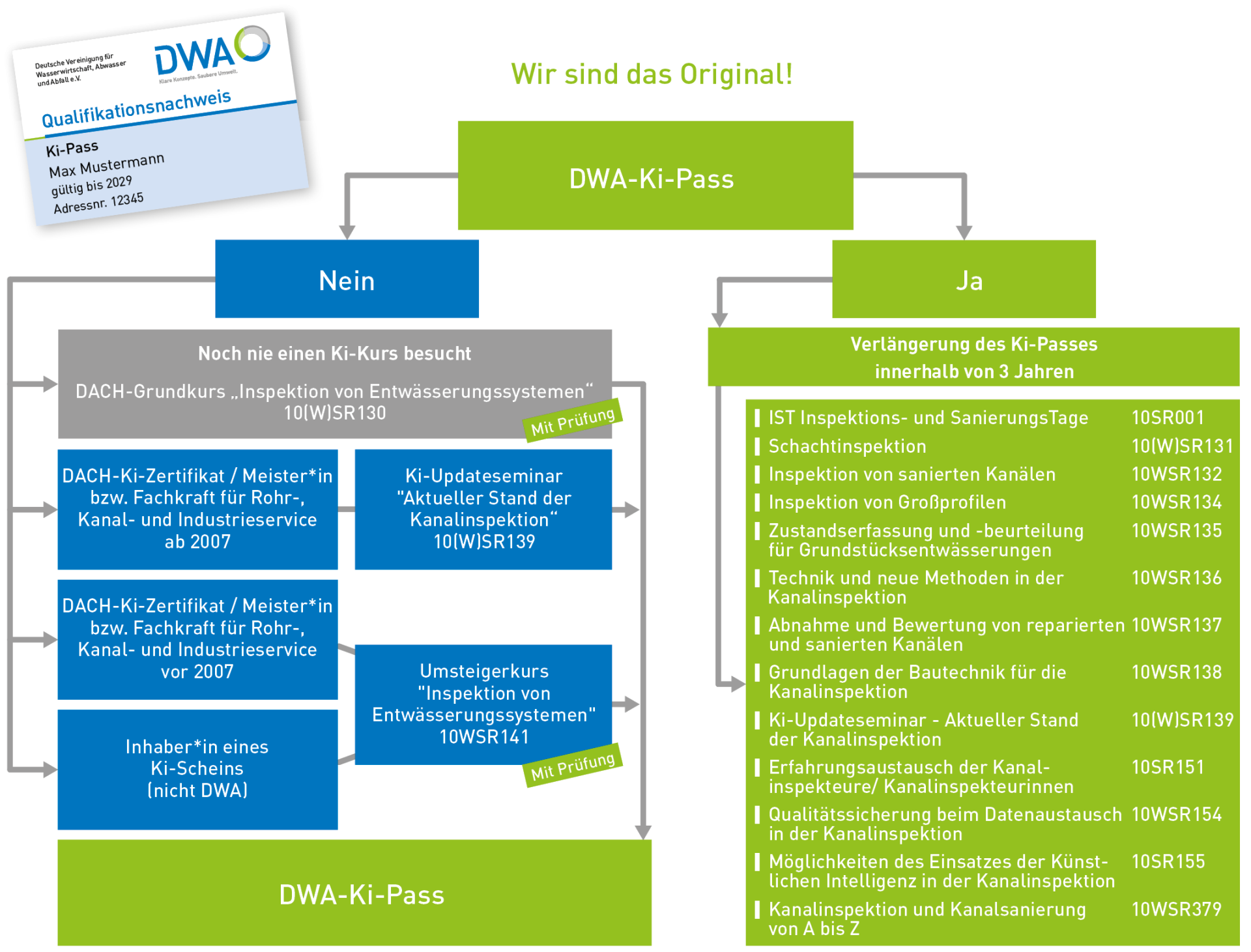 regelmäßig, maximal alle drei Jahre, fort- und weiterbilden. Aus diesem Grund führte die DWA 2012 den Ki-Pass ein. So haben alle erfolgreich bestandenen Teilnehmerinnen und Teilnehmer einen regelkonformen Nachweis in der Hand, der beweist, ihr Wissen ist auf dem aktuellen Stand. Wer den Ki-Pass verlängern möchte, muss innerhalb von 3 Jahren eine mindestens eintägige Veranstaltung besuchen.