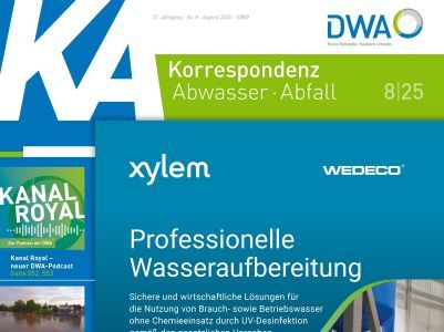 Die DWA-Verbandszeitschrift KA Korrespondenz Abwasser, Abfall (KA) gilt als führende Zeitschrift im Abwasserbereich. Mit einer tatsächlich verbreitetet Auflage von 10.813 Heften (IVW 7/24-6/25) erreichen Sie zielgerichtet die Ingenieur*innen, Meister*innen und Fachkräfte der Branche.